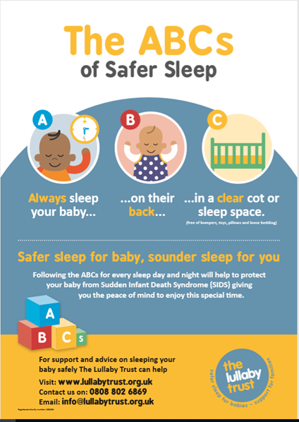 | The safest place for your baby to sleep is on their back in a cot in a room with you for the first six months. | Don't let your baby get too hot. |