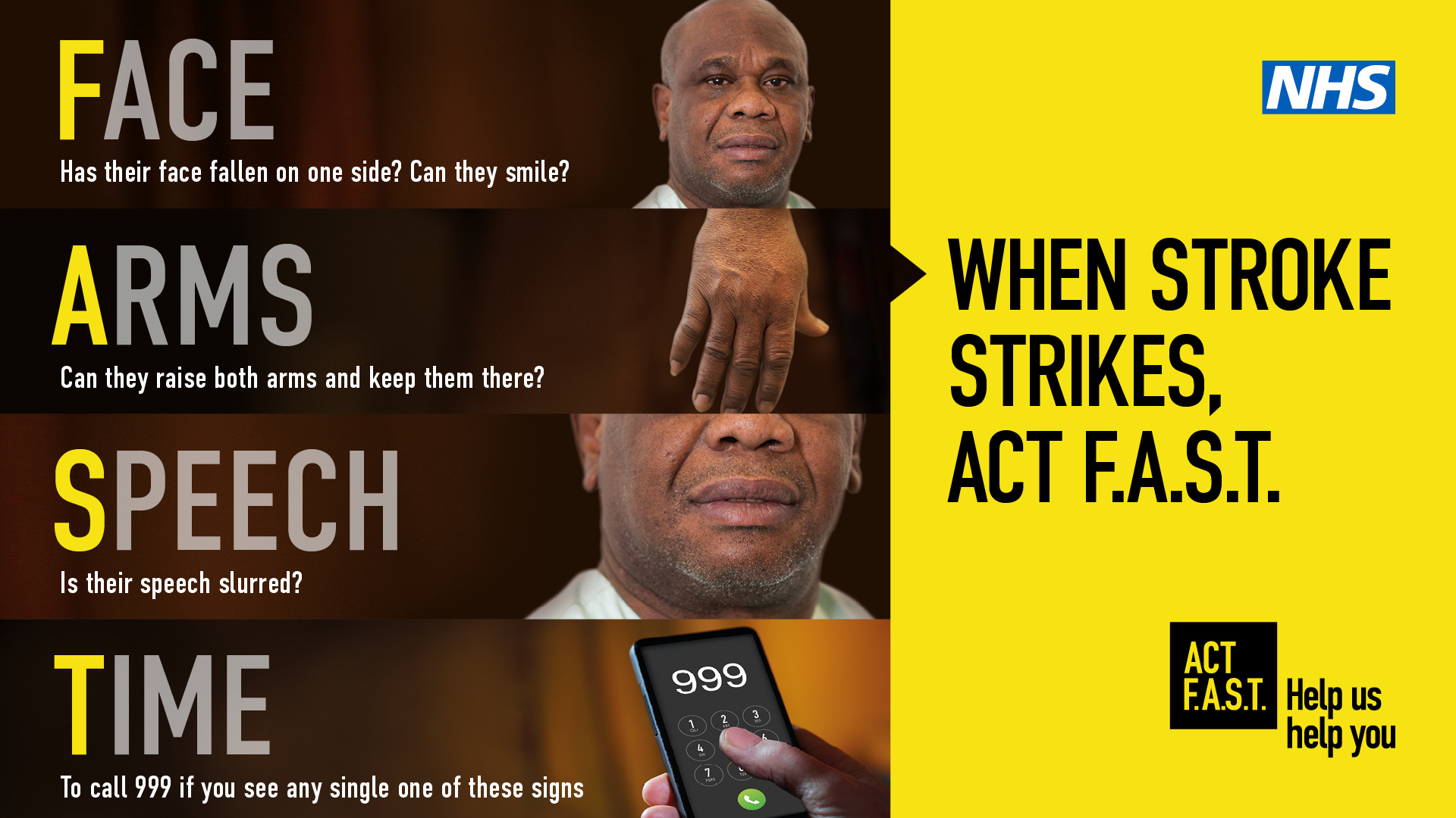 - Time – it's time to dial 999 immediately if you see any of these signs or symptoms.
