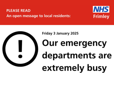 Dear patients and families, We want to share some important updates regarding our current situation at our Frimley Park and Wexham Park Hospitals. Our commitment to providing safe and high-quality care remains our top priority, but we are facing sustained and significant pressures across our services. We need your help to ensure that those who need urgent care can receive it ...