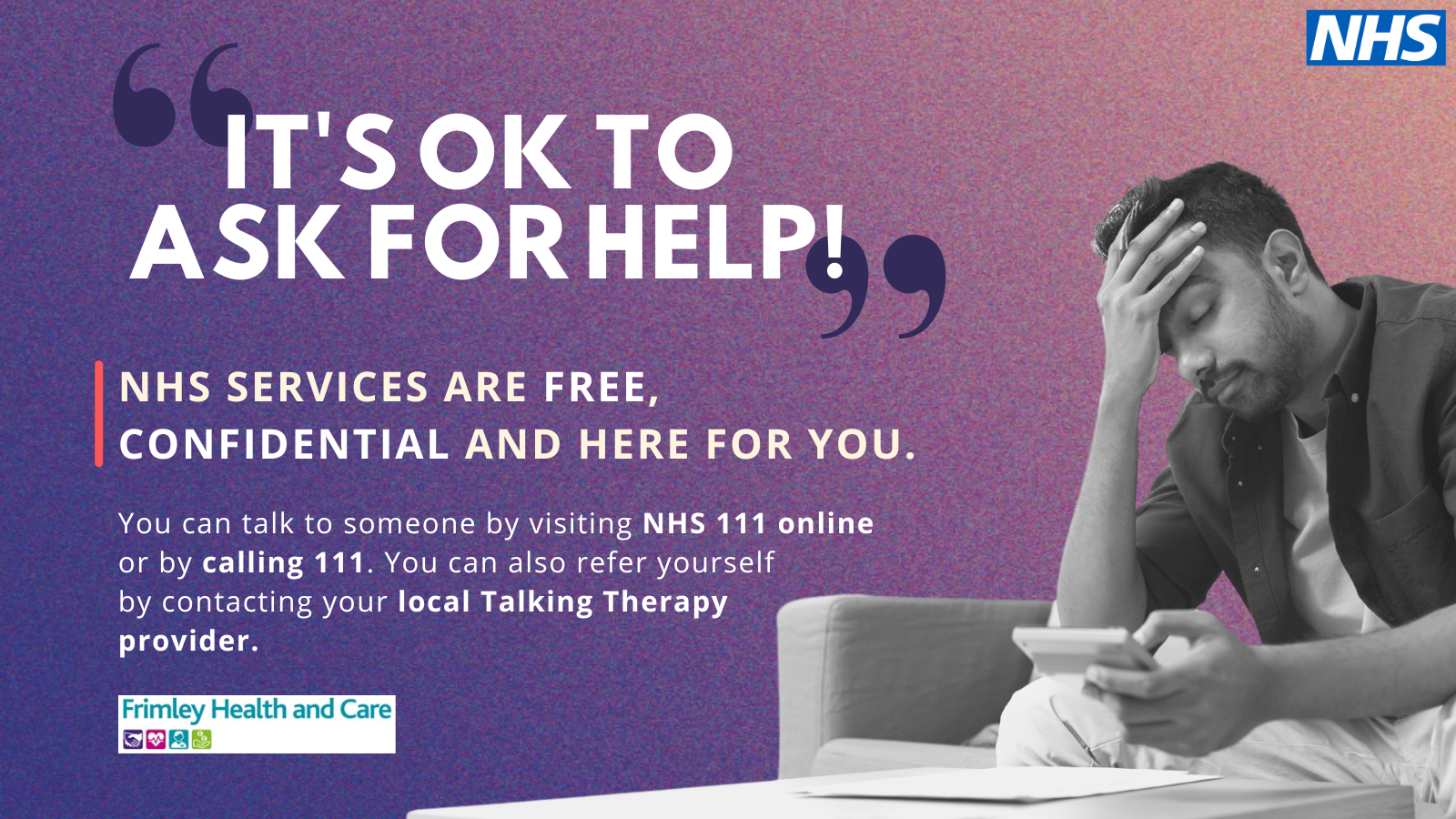 If you are struggling with your mental health can use NHS 111 online or call 111. You can also refer yourself to your local Talking Therapy provider. For more general mental wellbeing advice, visit the Every Mind Matters website.